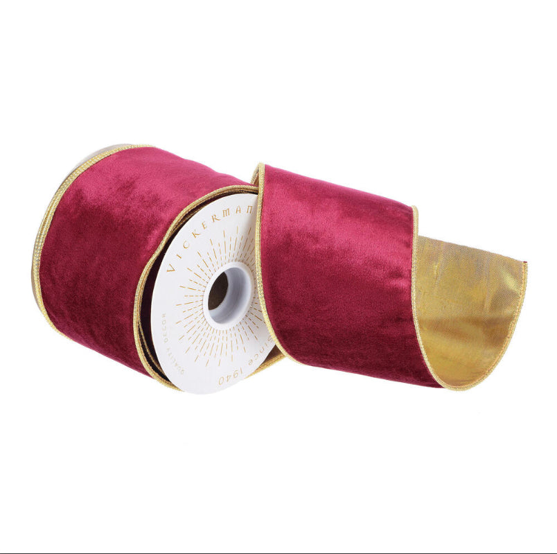 Vickerman 4" x 10 Yards Burgundy/Gold Velvet Wired Edge Christmas Ribbon. Add this beautiful ribbon to any arrangement, holiday tree, or as a stylish accent to your gift wrapping projects. This ribbon is made of polyester and features a wired edge that allows bending and shaping for easy decorating. It measures 4 inches wide and 10 yards long.