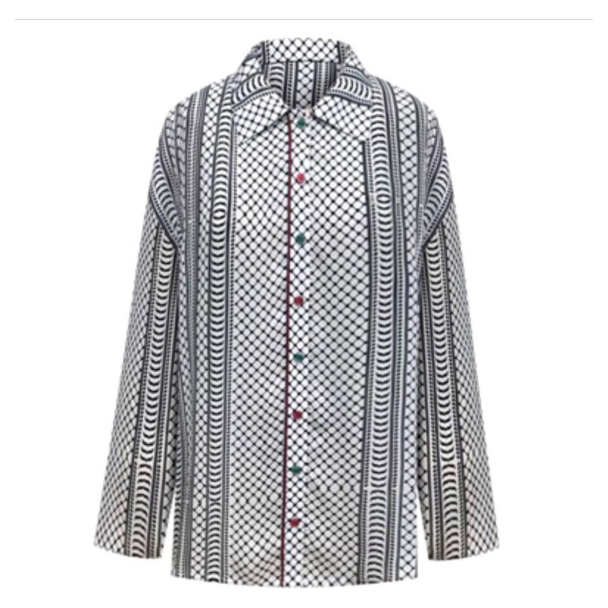 Keffiyeh pj shirt is a versatile piece that can be styled in multiple ways, whether tied at the waist or buttoned up with matching trousers or contrast