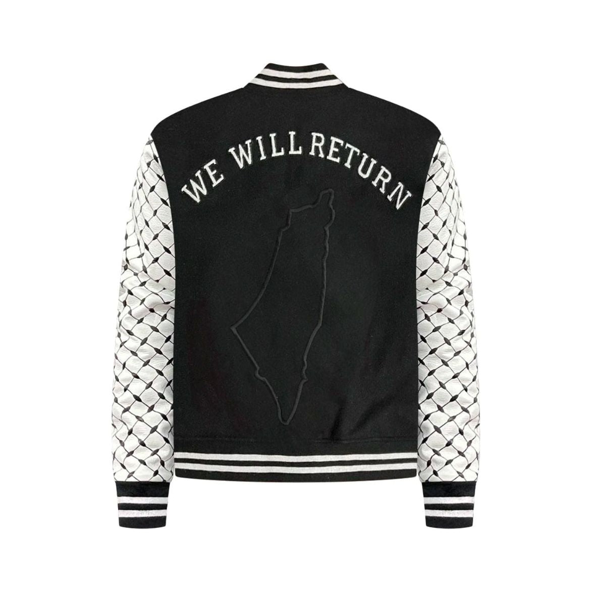 ANZ Varsity jacket, crafted with 100% real leather sleeves featuring the Keffiyeh print. Featuring chenille embroidery.
